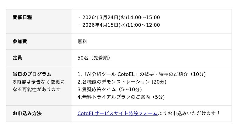 「AI分析ツールCotoEL(コトエル)」のサービス紹介および操作説明会(オンライン・無料)を開催しています。