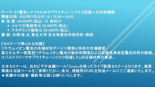 先端技術情報や市場情報を提供している(株)シーエムシー・リサーチ(千代田区神田錦町: https://cmcre.com/ )では、 各種材料・化学品などの市場動向・技術動向のセミナーや書籍発行を行っておりますが、 このたび「EV電池レアメタルのサプライチェーンリスク回避への材料戦略」と題するセミナーを、 講師に本間 格 氏 東北大学 多元物質科学研究所・教授)をお迎えし、2022年3月22日(火)13:30より、 ZOOMを利用したライブ配信で開催いたします。 受講料は、 一般:44,000円(税込)、 弊社メルマガ会員:39,600円(税込)、 アカデミック価格は26,400円(税込)となっております(資料付)。