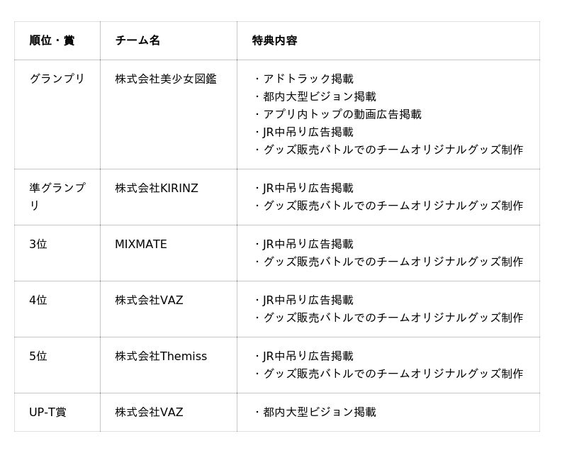 8組のチームが参加した今回の「ミクチャリーグ」では、約2ヶ月間に及ぶ審査期間を経て、株式会社美少女図鑑チームが栄えあるグランプリの座に輝きました。また、準グランプリには株式会社KIRINZチーム、3位にはMIXMATEチーム、そしてUP-T賞には株式会社VAZチームがそれぞれ選ばれました。グランプリにはアドトラックや都内大型ビジョン、「ミクチャ」アプリ内トップへの動画広告掲載など、今後の活動を後押しする豪華特典が送られます。