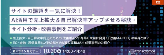 トランスコスモストランスコスモスは、オンラインセミナーサイトの課題を一気に解決!AI活用で売上拡大&自己解決率アップさせる秘訣・サイト分析・改善事例をご紹介を10月30日(水)に開催します。