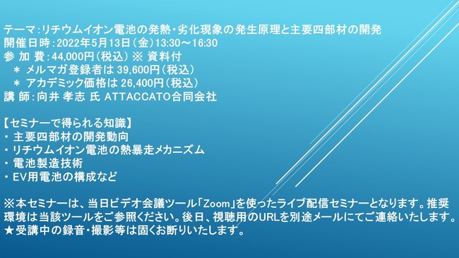 先端技術情報や市場情報を提供している(株)シーエムシー・リサーチ(千代田区神田錦町: https://cmcre.com/ )では、 各種材料・化学品などの市場動向・技術動向のセミナーや書籍発行を行っておりますが、 このたび「リチウムイオン電池の発熱・劣化現象の発生原理と主要四部材の開発」と題するセミナーを、 講師に向井 孝志 氏 ATTACCATO合同会社)をお迎えし、2022年5月13日(金)13:30より、 ZOOMを利用したライブ配信で開催いたします。 受講料は、 一般:44,000円(税込)、 弊社メルマガ会員:39,600円(税込)、 アカデミック価格は26,400円(税込)となっております(資料付)。
