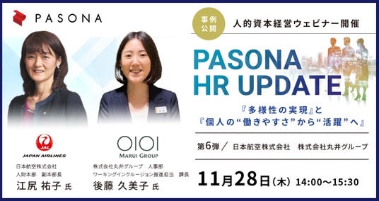 株式会社パソナは、2024年11月28日(木)に人的資本経営に関する事例登壇ウェビナーPASONA HR UPDATE『多様性の実現』と『個人の“働きやすさ”から“活躍”へ』をオンラインにて開催いたします。