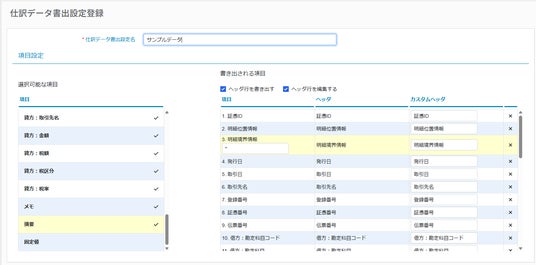 ・各種会計ソフトに対応した形式での仕訳データ出力各種会計ソフトでの取り込みに適した形式で、仕訳データのテンプレート作成・CSV出力ができます。出力項目名の変更・選択も可能です。
