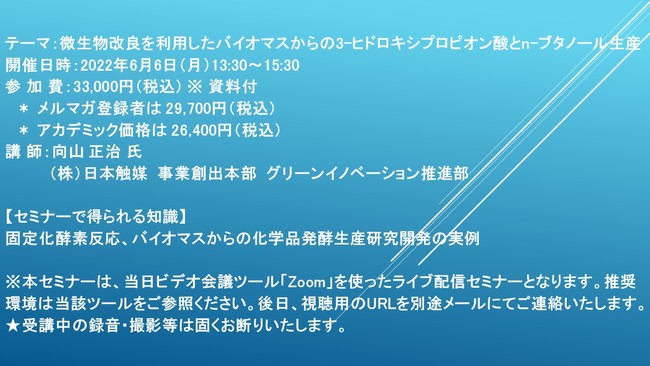 先端技術情報や市場情報を提供している(株)シーエムシー・リサーチ(千代田区神田錦町: https://cmcre.com/ )では、 各種材料・化学品などの市場動向・技術動向のセミナーや書籍発行を行っておりますが、 このたび「微生物改良を利用したバイオマスからの3-ヒドロキシプロピオン酸とn-ブタノール生産」と題するセミナーを、 講師に向山 正治 氏 (株)日本触媒 事業創出本部 グリーンイノベーション推進部)をお迎えし、2022年6月6日(月)13:30より、 ZOOMを利用したライブ配信で開催いたします。 受講料は、 一般:33,000円(税込)、 弊社メルマガ会員:29,700円(税込)、 アカデミック価格は26,400円(税込)となっております(資料付)。