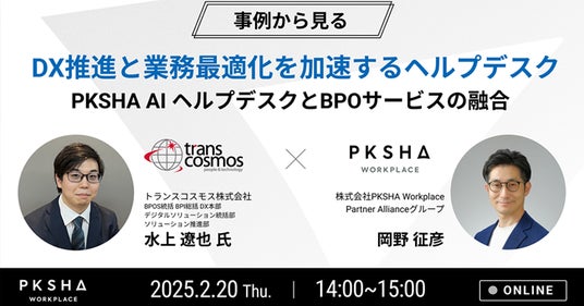 トランスコスモストランスコスモスは、オンラインセミナーDX推進と業務最適化を加速するヘルプデスクPKSHA AI ヘルプデスクとBPOサービスの融合へ2/20(木)に開催します。