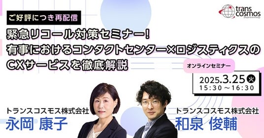 トランスコスモスは、オンラインセミナーご好評につき再配信緊急リコール対策セミナー!有事におけるコンタクトセンター×ロジスティクスのCXサービスを徹底解説を3/25(火)に開催します。