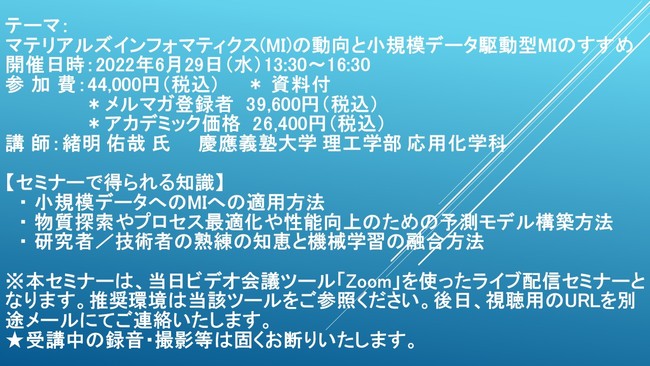 先端技術情報や市場情報を提供している(株)シーエムシー・リサーチ(千代田区神田錦町: https://cmcre.com/ )では、 各種材料・化学品などの市場動向・技術動向のセミナーや書籍発行を行っておりますが、 このたび「マテリアルズインフォマティクス(MI)の動向と小規模データ駆動型MIのすすめ」と題するセミナーを、 講師に緒明 佑哉 氏 慶應義塾大学 理工学部 応用化学科)をお迎えし、2022年6月29日(水)13:30より、 ZOOMを利用したライブ配信で開催いたします。 受講料は、 一般:44,000円(税込)、 弊社メルマガ会員:39,600円(税込)、 アカデミック価格は26,400円(税込)となっております(資料付)。