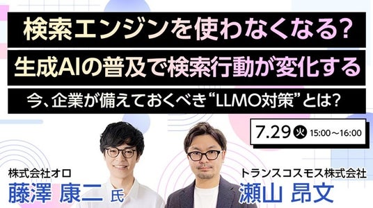 トランスコスモスは、オンラインセミナー検索エンジンを使わなくなる?生成AIの普及で検索行動が変化する~今、企業が備えておくべき“LLMO対策”とは?~を7月29日(火)に開催します。