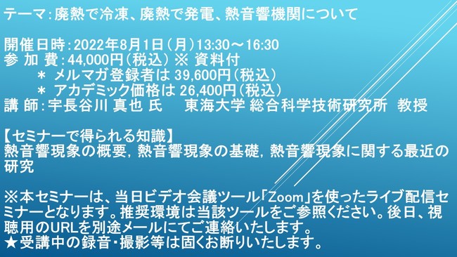 先端技術情報や市場情報を提供している(株)シーエムシー・リサーチ(千代田区神田錦町: https://cmcre.com/ )では、 各種材料・化学品などの市場動向・技術動向のセミナーや書籍発行を行っておりますが、 このたび「廃熱で冷凍、廃熱で発電、熱音響機関について」と題するセミナーを、 講師に長谷川 真也 氏 東海大学 総合科学技術研究所 教授)をお迎えし、2022年8月1日(月)13:30より、 ZOOMを利用したライブ配信で開催いたします。 受講料は、 一般:44,000円(税込)、 弊社メルマガ会員:39,600円(税込)、 アカデミック価格は26,400円(税込)となっております(資料付)。