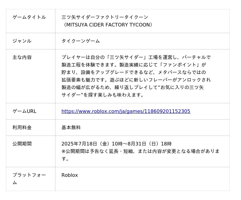 トランスコスモスは、アサヒ飲料と連携し、飲料メーカーとして日本初(※1)となる Roblox向けゲーム『三ツ矢サイダーファクトリータイクーン(MITSUYA CIDER FACTORY TYCOON)』を2025年7月18日(金)10時に公開します。