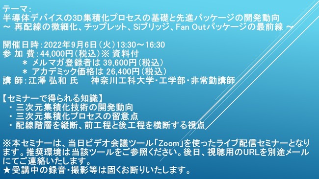 先端技術情報や市場情報を提供している(株)シーエムシー・リサーチ(千代田区神田錦町: https://cmcre.com/ )では、 各種材料・化学品などの市場動向・技術動向のセミナーや書籍発行を行っておりますが、 このたび「半導体デバイスの3D集積化プロセスの基礎と先進パッケージの開発動向」と題するセミナーを、 講師に江澤 弘和 氏 神奈川工科大学・工学部・非常勤講師)をお迎えし、2022年9月6日(火)13:30より、 ZOOMを利用したライブ配信で開催いたします。 受講料は、 一般:44,000円(税込)、 弊社メルマガ会員:39,600円(税込)、 アカデミック価格は26,400円(税込)となっております(資料付)。