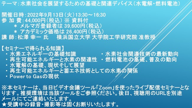 先端技術情報や市場情報を提供している(株)シーエムシー・リサーチ(千代田区神田錦町: https://cmcre.com/ )では、 各種材料・化学品などの市場動向・技術動向のセミナーや書籍発行を行っておりますが、 このたび「水素社会を展望するための基礎と関連デバイス(水電解・燃料電池)」と題するセミナーを、 講師に松澤 幸一 氏 横浜国立大学 大学院工学研究院 准教授)をお迎えし、2022年9月13日(火)13:30より、 ZOOMを利用したライブ配信で開催いたします。 受講料は、 一般:44,000円(税込)、 弊社メルマガ会員:39,600円(税込)、 アカデミック価格は26,400円(税込)となっております(資料付)。