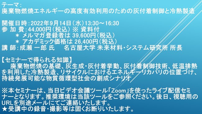 先端技術情報や市場情報を提供している(株)シーエムシー・リサーチ(千代田区神田錦町: https://cmcre.com/ )では、 各種材料・化学品などの市場動向・技術動向のセミナーや書籍発行を行っておりますが、 このたび「廃棄物燃焼エネルギーの高度有効利用のための灰付着制御と冷熱製造」と題するセミナーを、 講師に成瀬 一郎 氏 名古屋大学 未来材料・システム研究所 所長)をお迎えし、2022年9月14日(水)13:30より、 ZOOMを利用したライブ配信で開催いたします。 受講料は、 一般:44,000円(税込)、 弊社メルマガ会員:39,600円(税込)、 アカデミック価格は26,400円(税込)となっております(資料付)。