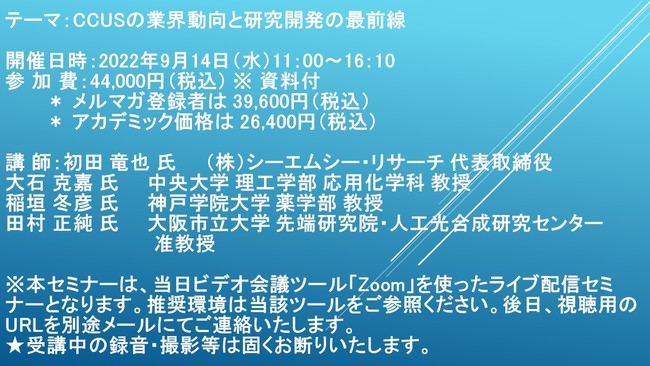 先端技術情報や市場情報を提供している(株)シーエムシー・リサーチ(千代田区神田錦町: https://cmcre.com/ )では、 各種材料・化学品などの市場動向・技術動向のセミナーや書籍発行を行っておりますが、 このたび「CCUSの業界動向と研究開発の最前線」と題するセミナーを、 講師に初田 竜也 氏 (株)シーエムシー・リサーチ 代表取締役 大石 克嘉 氏 中央大学 理工学部 応用化学科 教授 稲垣 冬彦 氏 神戸学院大学 薬学部 教授 田村 正純 氏 大阪市立大学 先端研究院・人工光合成研究センター 准教授)をお迎えし、2022年9月14日(水)11:00より、 ZOOMを利用したライブ配信で開催いたします。 受講料は、 一般:44,000円(税込)、 弊社メルマガ会員:39,600円(税込)、 アカデミック価格は26,400円(税込)となっております(資料付)。