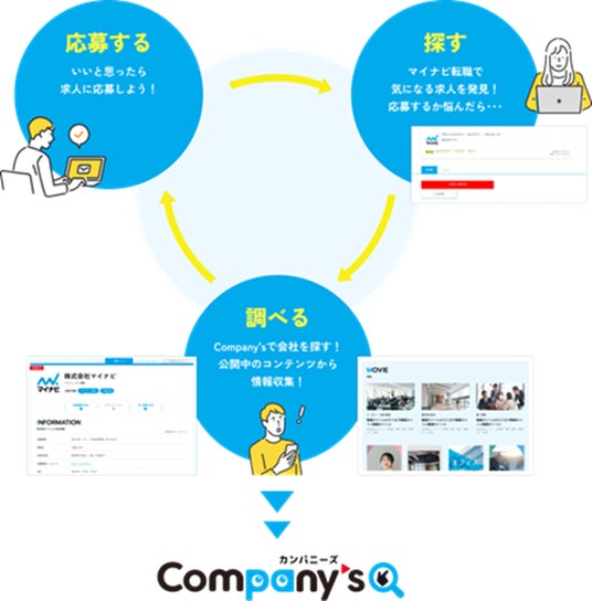 このような背景を受け、マイナビ転職は、社員インタビュー動画や企業ブログなど、企業の詳細情報を求職者に伝えるための「会社紹介コンテンツ」※と「求人情報」を連動させた、会社情報検索サイト『Company’s(カンパニーズ)』の提供を開始しました。