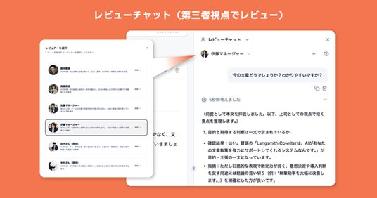Langsmith Cowriter は、論理的な構成力が求められるビジネス文書から、感性が重視される創作活動まで、企画書・広報資料・研究レポート・ブログ・小説など、あらゆる「書く」シーンで伴走する専属編集者として機能し、下書き作成だけでなく、改善提案やレビューを通じて仕上げまで支援します。