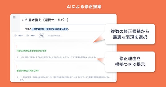 直し方を選べる:AIが意図を保ったまま複数の修正案(短くする/丁寧にする/論理を補う等)を出し、比較して採用できます