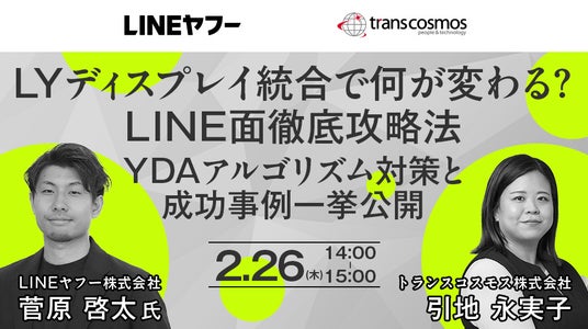 トランスコスモストランスコスモスは、オンラインセミナーLYディスプレイ統合で何が変わる?LINE面徹底攻略法 YDAアルゴリズム対策と成功事例一挙公開を2月26日(木)に開催します。