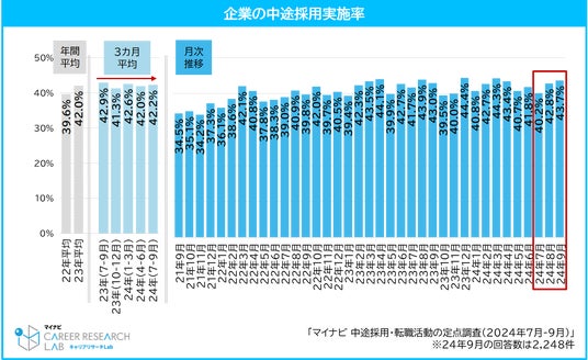 2024年9月の企業の中途採用実施率は43.7%だった。
