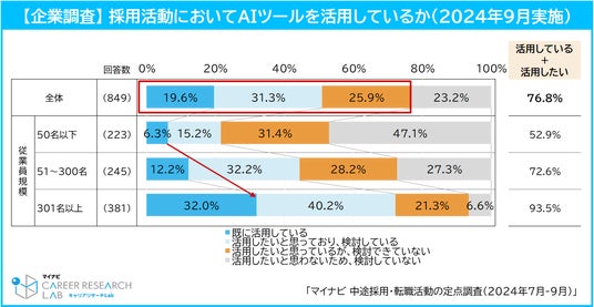 企業の中途採用担当者に対して、採用活動でAIツールを活用しているか聞いたところ、「既に活用している」は19.6%だった。「活用したいと思っており、検討している(31.3%)」「活用したいと思っているが、検討できていない(25.9%)」と合わせて約8割が、採用活動でAIツールを活用することに対して前向きであることがわかった。