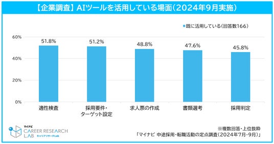 すでにAIツールを活用している企業に、活用場面を聞いたところ、「適性検査(51.8%)」が最も多く、次いで「採用要件・ターゲット設定(51.2%)」、「求人票の作成(48.8%)」と続いた。【図7】