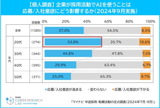 20代の2人に1人以上が採用活動でAIを使っている企業に対して 「応募/入社意欲が高まる」と回答。理由は「新しい技術導入への好感」「感情ではなく公平に評価してくれそう」が上位