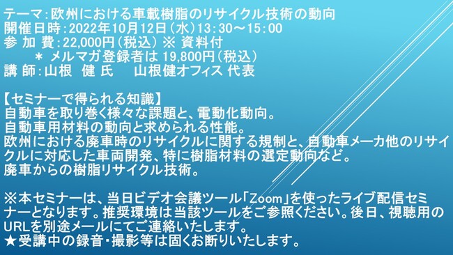 先端技術情報や市場情報を提供している(株)シーエムシー・リサーチ(千代田区神田錦町: https://cmcre.com/ )では、 各種材料・化学品などの市場動向・技術動向のセミナーや書籍発行を行っておりますが、 このたび「欧州における車載樹脂のリサイクル技術の動向」と題するセミナーを、 講師に山根 健 氏 山根健オフィス 代表)をお迎えし、2022年10月12日(水)13:30より、 ZOOMを利用したライブ配信で開催いたします。 受講料は、 一般:22,000円(税込)、 弊社メルマガ会員:19,800円(税込)となっております(資料付)。