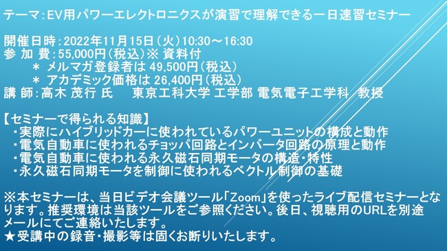 先端技術情報や市場情報を提供している(株)シーエムシー・リサーチ(千代田区神田錦町: https://cmcre.com/ )では、 各種材料・化学品などの市場動向・技術動向のセミナーや書籍発行を行っておりますが、 このたび「EV用パワーエレクトロニクスが演習で理解できる一日速習セミナー」と題するセミナーを、 講師に高木 茂行 氏 東京工科大学 工学部 電気電子工学科 教授)をお迎えし、2022年11月15日(火)10:30より、 ZOOMを利用したライブ配信で開催いたします。 受講料は、 一般:55,000円(税込)、 弊社メルマガ会員:49,500円(税込)、 アカデミック価格は26,400円(税込)となっております(資料付)。