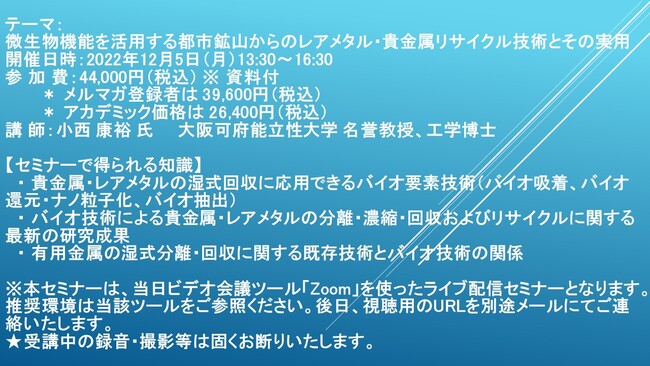 先端技術情報や市場情報を提供している(株)シーエムシー・リサーチ(千代田区神田錦町: https://cmcre.com/ )では、 各種材料・化学品などの市場動向・技術動向のセミナーや書籍発行を行っておりますが、 このたび「微生物機能を活用する都市鉱山からのレアメタル・貴金属リサイクル技術とその実用」と題するセミナーを、 講師に小西 康裕 氏 大阪可府能立性大学 名誉教授、工学博士)をお迎えし、2022年12月5日(月)13:30より、 ZOOMを利用したライブ配信で開催いたします。 受講料は、 一般:44,000円(税込)、 弊社メルマガ会員:39,600円(税込)、 アカデミック価格は26,400円(税込)となっております(資料付)。