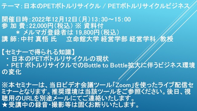 先端技術情報や市場情報を提供している(株)シーエムシー・リサーチ(千代田区神田錦町: https://cmcre.com/ )では、 各種材料・化学品などの市場動向・技術動向のセミナーや書籍発行を行っておりますが、 このたび「日本のPETボトルリサイクル / PETボトルリサイクルビジネス」と題するセミナーを、 講師に中村 真悟 氏 立命館大学 経営学部 経営学科 教授)をお迎えし、2022年12月12日(月)13:30より、 ZOOMを利用したライブ配信で開催いたします。 受講料は、 一般:22,000円(税込)、 弊社メルマガ会員:19,800円(税込)、 アカデミック価格は<アカ>となっております(資料付)。