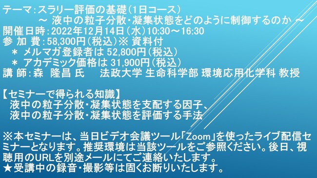 先端技術情報や市場情報を提供している(株)シーエムシー・リサーチ(千代田区神田錦町: https://cmcre.com/ )では、 各種材料・化学品などの市場動向・技術動向のセミナーや書籍発行を行っておりますが、 このたび「スラリー評価の基礎(1日コース) ~ 液中の粒子分散・凝集状態をどのように制御するのか ~」と題するセミナーを、 講師に森 隆昌 氏 法政大学 生命科学部 環境応用化学科 教授)をお迎えし、2022年12月14日(水)10:30より、 ZOOMを利用したライブ配信で開催いたします。 受講料は、 一般:58,300円(税込)、 弊社メルマガ会員:52,800円(税込)、 アカデミック価格は31,900円(税込)となっております(資料付)。