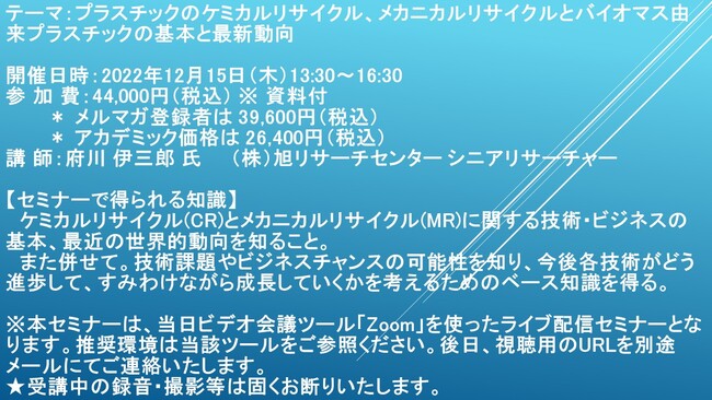 先端技術情報や市場情報を提供している(株)シーエムシー・リサーチ(千代田区神田錦町: https://cmcre.com/ )では、 各種材料・化学品などの市場動向・技術動向のセミナーや書籍発行を行っておりますが、 このたび「プラスチックのケミカルリサイクル、メカニカルリサイクルとバイオマス由来プラスチックの基本と最新動向」と題するセミナーを、 講師に府川 伊三郎 氏 (株)旭リサーチセンター シニアリサーチャー)をお迎えし、2022年12月15日(木)13:30より、 ZOOMを利用したライブ配信で開催いたします。 受講料は、 一般:44,000円(税込)、 弊社メルマガ会員:39,600円(税込)、 アカデミック価格は26,400円(税込)となっております(資料付)。