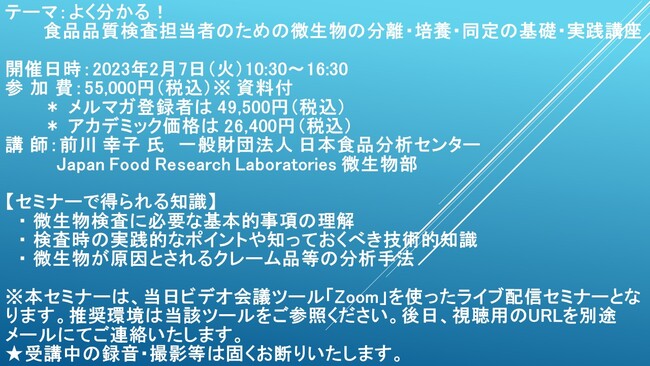 先端技術情報や市場情報を提供している(株)シーエムシー・リサーチ(千代田区神田錦町: https://cmcre.com/ )では、 各種材料・化学品などの市場動向・技術動向のセミナーや書籍発行を行っておりますが、 このたび「よく分かる! 食品品質検査担当者のための微生物の分離・培養・同定の基礎・実践講座」と題するセミナーを、 講師に前川 幸子 氏 一般財団法人 日本食品分析センター Japan Food Research Laboratories 微生物部)をお迎えし、2023年2月7日(火)13:30より、 ZOOMを利用したライブ配信で開催いたします。 受講料は、 一般:44,000円(税込)、 弊社メルマガ会員:39,600円(税込)、 アカデミック価格は26,400円(税込)となっております(資料付)。