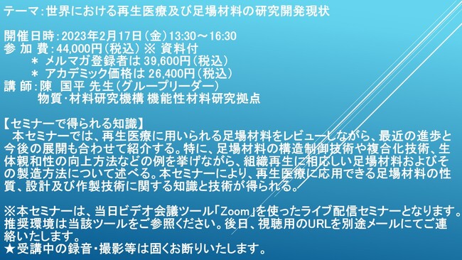 先端技術情報や市場情報を提供している(株)シーエムシー・リサーチ(千代田区神田錦町: https://cmcre.com/ )では、 各種材料・化学品などの市場動向・技術動向のセミナーや書籍発行を行っておりますが、 このたび「世界における再生医療及び足場材料の研究開発現状」と題するセミナーを、 講師に陳 国平 先生(グループリーダー) 物質・材料研究機構 機能性材料研究拠点)をお迎えし、2023年2月17日(金)13:30より、 ZOOMを利用したライブ配信で開催いたします。 受講料は、 一般:44,000円(税込)、 弊社メルマガ会員:39,600円(税込)、 アカデミック価格は26,400円(税込)となっております(資料付)。
