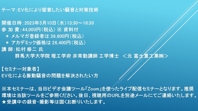 先端技術情報や市場情報を提供している(株)シーエムシー・リサーチ(千代田区神田錦町: https://cmcre.com/ )では、 各種材料・化学品などの市場動向・技術動向のセミナーや書籍発行を行っておりますが、 このたび「EV化により留意したい騒音と対策技術」と題するセミナーを、 講師に松村 修二 氏 (群馬大学大学院 理工学府 非常勤講師 工学博士 <元 富士重工業(株)>)をお迎えし、2023年5月10日(水)13:30より、 ZOOMを利用したライブ配信で開催いたします。 受講料は、 一般:44,000円(税込)、 弊社メルマガ会員:39,600円(税込)、 アカデミック価格は26,400円(税込)となっております(資料付)。