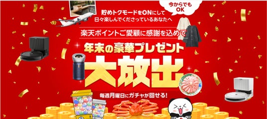 ・キャンペーン内容: 「貯めトクモード」の設定をオンにすると、「利息プラスポイント」の残高に応じて遊ぶことができ、当選すると豪華景品や「楽天ポイント」10,000ポイントなどが当たります。