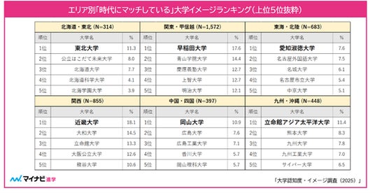志望校の検討に影響するイメージは「学べる内容が充実している」が最多【図3】【調査概要】◆大学認知度ランキング1位、関東・甲信越エリアは早稲田大学、関西エリアは4年連続で近畿大学。「時代にマッチしている」大学は東海・北陸エリアでは愛知淑徳大学、九州・沖縄エリアでは立命館アジア太平洋大学が1位にエリア別大学認知度ランキングにおいて、関東・甲信越エリアでは前回2位だった早稲田大学が1位となり、関西エリアは近畿大学が4年連続1位となった。その他のエリアでは国立大学が上位にランクインし、北海道・東北エリアは東北大学、中国・四国エリアは広島大学が1位を獲得した。「時代にマッチしている」大学イメージランキングでは、東海・北陸エリアでは愛知淑徳大学、九州・沖縄エリアでは立命館アジア太平洋大学が1位となり、新学部の設立や、充実した教育環境の整備・取り組みなどが評価につながったと考えられる。【図1、2】
