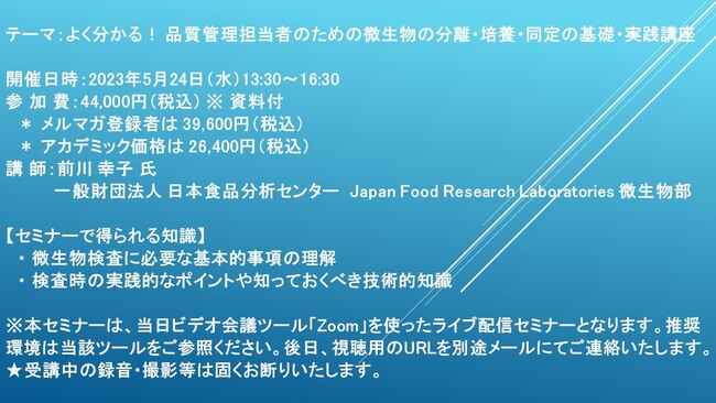 先端技術情報や市場情報を提供している(株)シーエムシー・リサーチ(千代田区神田錦町: https://cmcre.com/ )では、 各種材料・化学品などの市場動向・技術動向のセミナーや書籍発行を行っておりますが、 このたび「よく分かる! 品質管理担当者のための微生物の分離・培養・同定の基礎・実践講座」と題するセミナーを、 講師に前川 幸子 氏 (一般財団法人 日本食品分析センター Japan Food Research Laboratories 微生物部)をお迎えし、2023年5月24日(水)13:30より、 ZOOMを利用したライブ配信で開催いたします。 受講料は、 一般:44,000円(税込)、 弊社メルマガ会員:39,600円(税込)、 アカデミック価格は26,400円(税込)となっております(資料付)。