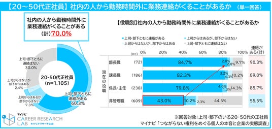 また、勤務時間外に「連絡をすることがある」も69.6%に達し、「上司・部下の両方に連絡する」が61.0%で最多、部長クラスが90.3%で最も高く、非管理職は43.7%で最も低い。