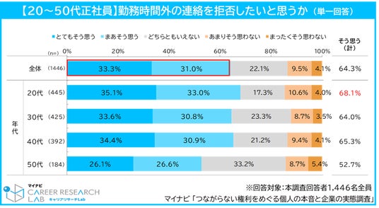 ◆正社員の6割以上が勤務時間外の業務連絡については「拒否したい」。一方、「気にしない」「外資系企業は時差があるので当たり前」という声も「勤務時間外の業務連絡を拒否したいと思うか」を聞くと、64.3%が「そう思う(計)」と回答した。年代別では20代(68.1%)が最多となり、40代(65.3%)、30代(64.4%)と続き、50代は52.7%と他年代より低く、年代によって勤務時間外連絡の拒否感には差がみられた。