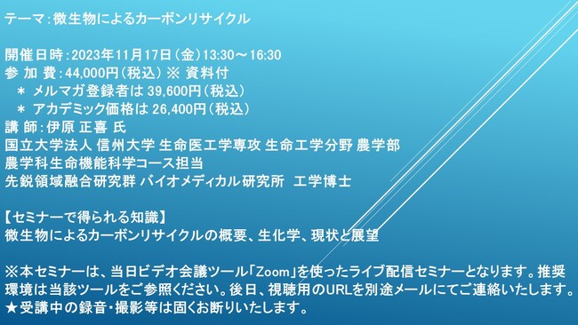 先端技術情報や市場情報を提供している(株)シーエムシー・リサーチ(千代田区神田錦町: https://cmcre.com/ )では、 各種材料・化学品などの市場動向・技術動向のセミナーや書籍発行を行っておりますが、 このたび「微生物によるカーボンリサイクル」と題するセミナーを、 講師に伊原 正喜 氏 (国立大学法人 信州大学 生命医工学専攻 生命工学分野 農学部 農学科生命機能科学コース担当 先鋭領域融合研究群 バイオメディカル研究所 工学博士)をお迎えし、2023年11月17日(金)13:30より、 ZOOMを利用したライブ配信で開催いたします。 受講料は、 一般:44,000円(税込)、 弊社メルマガ会員:39,600円(税込)、 アカデミック価格は26,400円(税込)となっております(資料付)。 セミナーの詳細とお申し込みは、 弊社の以下URLをご覧ください! https://cmcre.com/archives/116924/ 質疑応答の時間もございますので、 是非奮ってご参加ください。