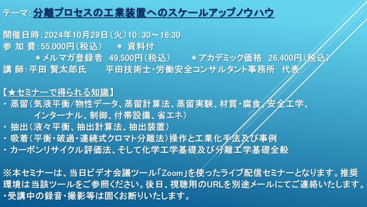 https://cmcre.com/ )では、 各種材料・化学品などの市場動向・技術動向のセミナーや書籍発行を行っておりますが、 このたび「分離プロセスの工業装置へのスケールアップノウハウ」と題するセミナーを、 講師に平田 賢太郎氏 (平田技術士・労働安全コンサルタント事務所 代表)をお迎えし、2024年10月29日(火)10:30より、 ZOOMを利用したライブ配信で開催いたします。 受講料は、 一般:55,000円(税込)、 弊社メルマガ会員:49,500円(税込)、 アカデミック価格は26,400円(税込)となっております(資料付)。