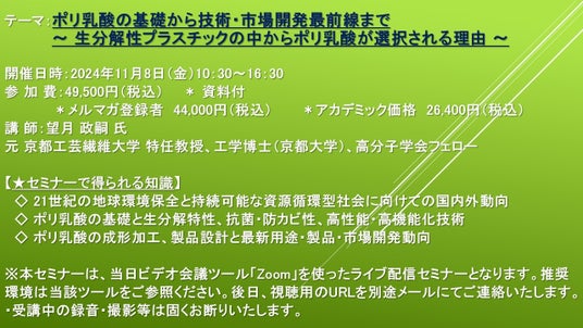 https://cmcre.com/ )では、 各種材料・化学品などの市場動向・技術動向のセミナーや書籍発行を行っておりますが、 このたび「ポリ乳酸の基礎から技術・市場開発最前線まで ~ 生分解性プラスチックの中からポリ乳酸が選択される理由 ~」と題するセミナーを、 講師に望月 政嗣 氏 (元 京都工芸繊維大学 特任教授、工学博士(京都大学)、高分子学会フェロー)をお迎えし、2024年11月8日(金)10:30より、 ZOOMを利用したライブ配信で開催いたします。 受講料は、 一般:55,000円(税込)、 弊社メルマガ会員:49,500円(税込)、 アカデミック価格は26,400円(税込)となっております(資料付)。
