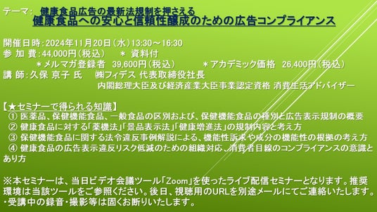 健康食品広告の最新法規制を押さえる 健康食品への安心と信頼性醸成のための広告コンプライアンス」と題するセミナーを、 講師に久保 京子 氏 ((株)フィデス 代表取締役社長 内閣総理大臣及び経済産業大臣事業認定資格 消費生活アドバイザー)をお迎えし、2024年11月20日(水)13:30より、 ZOOMを利用したライブ配信で開催いたします。 受講料は、 一般:44,000円(税込)、 弊社メルマガ会員:39,600円(税込)、 アカデミック価格は26,400円(税込)となっております(資料付)。