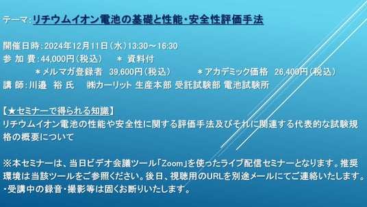 https://cmcre.com/ )では、 各種材料・化学品などの市場動向・技術動向のセミナーや書籍発行を行っておりますが、 このたび「リチウムイオン電池の基礎と性能・安全性評価手法」と題するセミナーを、 講師に川邉 裕 氏 ((株)カーリット 生産本部 受託試験部 電池試験所)をお迎えし、2024年12月11日(水)13:30より、 ZOOMを利用したライブ配信で開催いたします。 受講料は、 一般:44,000円(税込)、 弊社メルマガ会員:39,600円(税込)、 アカデミック価格は26,400円(税込)となっております(資料付)。
