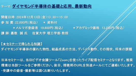 https://cmcre.com/ )では、 各種材料・化学品などの市場動向・技術動向のセミナーや書籍発行を行っておりますが、 このたび「ダイヤモンド半導体の基礎と応用、最新動向」と題するセミナーを、 講師に嘉数 誠 氏 (佐賀大学 理工学部 教授)をお迎えし、2024年12月13日(金)13:30より、 ZOOMを利用したライブ配信で開催いたします。 受講料は、 一般:22,000円(税込)、 弊社メルマガ会員:19,800円(税込)となっております(資料付)。