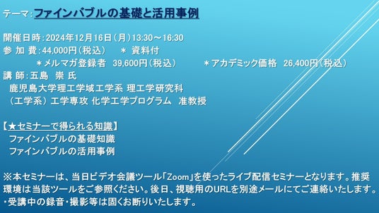 https://cmcre.com/ )では、 各種材料・化学品などの市場動向・技術動向のセミナーや書籍発行を行っておりますが、 このたび「ファインバブルの基礎と活用事例」と題するセミナーを、 講師に五島 崇 氏 (鹿児島大学理工学域工学系 理工学研究科 (工学系) 工学専攻 化学工学プログラム 准教授)をお迎えし、2024年12月16日(月)13:30より、 ZOOMを利用したライブ配信で開催いたします。 受講料は、 一般:44,000円(税込)、 弊社メルマガ会員:39,600円(税込)、 アカデミック価格は26,400円(税込)となっております(資料付)。