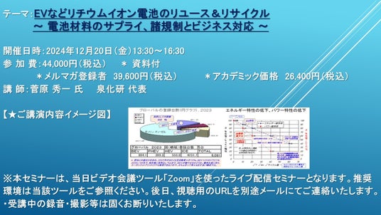 https://cmcre.com/ )では、 各種材料・化学品などの市場動向・技術動向のセミナーや書籍発行を行っておりますが、 このたび「EVなどリチウムイオン電池のリユース&リサイクル ~ 電池材料のサプライ、諸規制とビジネス対応 ~」と題するセミナーを、 講師に菅原 秀一 氏 (泉化研 代表)をお迎えし、2024年12月20日(金)13:30より、 ZOOMを利用したライブ配信で開催いたします。 受講料は、 一般:44,000円(税込)、 弊社メルマガ会員:39,600円(税込)、 アカデミック価格は26,400円(税込)となっております(資料付)。