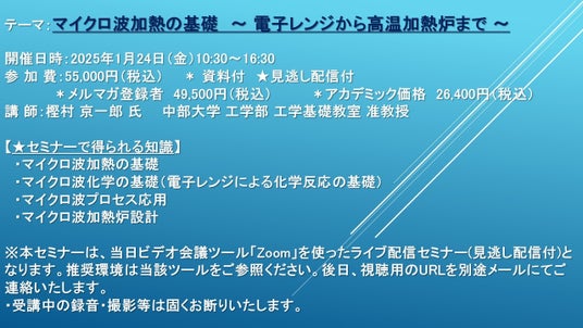 https://cmcre.com/ )では、 各種材料・化学品などの市場動向・技術動向のセミナーや書籍発行を行っておりますが、 このたび「マイクロ波加熱の基礎 ~ 電子レンジから高温加熱炉まで ~」と題するセミナーを、 講師に樫村 京一郎 氏 (中部大学 工学部 工学基礎教室 准教授)をお迎えし、2025年1月24日(金)10:30より、 ZOOMを利用したライブ配信(見逃し配信付き)で開催いたします。 受講料は、 一般:55,000円(税込)、 弊社メルマガ会員:49,500円(税込)、 アカデミック価格は26,400円(税込)となっております(資料付)。