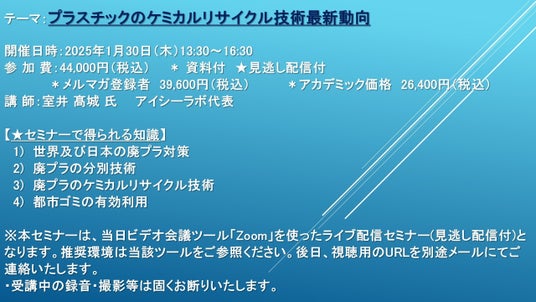 https://cmcre.com/ )では、 各種材料・化学品などの市場動向・技術動向のセミナーや書籍発行を行っておりますが、 このたび「プラスチックのケミカルリサイクル技術最新動向」と題するセミナーを、 講師に室井 高城 氏 (アイシーラボ代表)をお迎えし、2025年1月30日(木)13:30より、 ZOOMを利用したライブ配信(見逃し配信付き)で開催いたします。 受講料は、 一般:44,000円(税込)、 弊社メルマガ会員:39,600円(税込)、 アカデミック価格は26,400円(税込)となっております(資料付)。